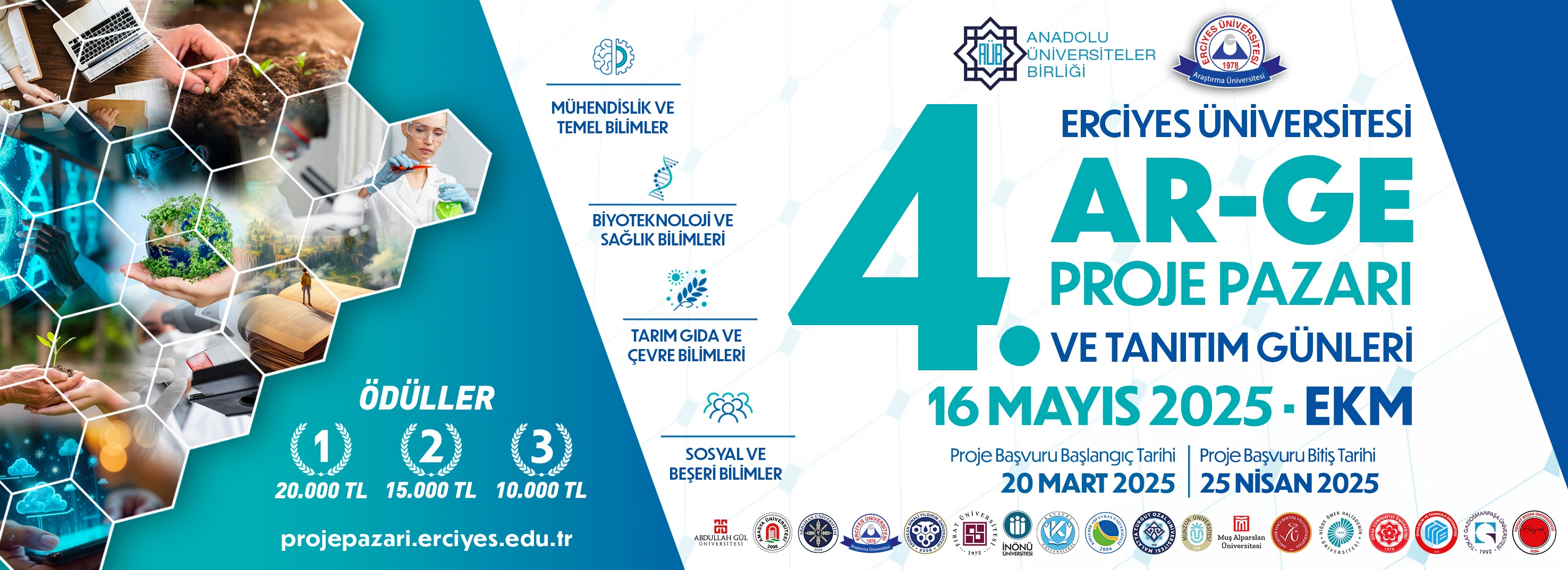 - Erciyes Üniversitesi tarafından organize edilmekte olan "Anadolu Üniversiteler Birliği 4. Ar-Ge Proje Pazarı" etkinliğine projeleriyle katılmak isteyen adaylar, proje önerilerini aşağıda sıralanan önerilere uygun şekilde hazırlayarak başvuru son tarihine kadar aşağıdaki linkteki formu doldurup gönderebilirler.
